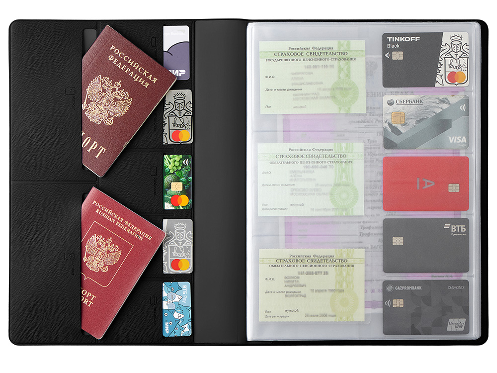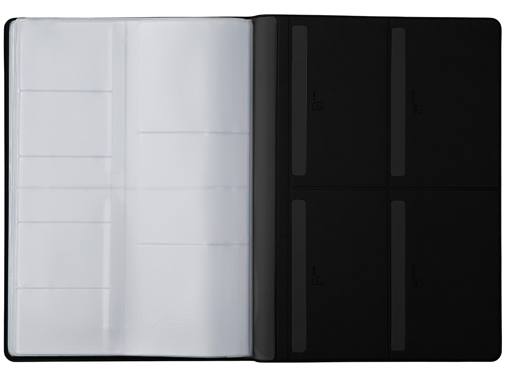 - 6 горизонтальных кармана 10 х 14 см с подписями и иконками, уточняющими тип документа, который можно поместить внутрь