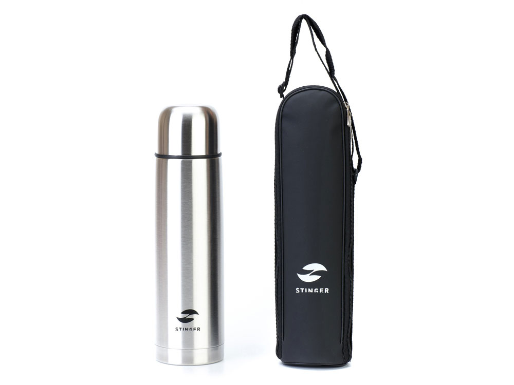 Термос Stinger с чехлом, 1 л, узкий, сталь/кожзаменитель, с чехлом, серебристый, 8,6 х 8,6 х 31,4 см, 441215